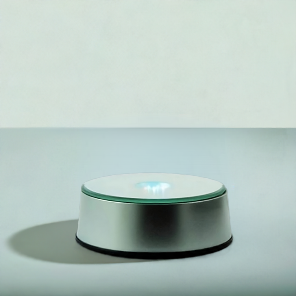 This is a small rotating LED light base, perfect for displaying small medium and large crystals.
